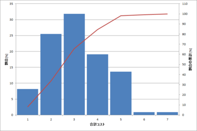 図「全カードの合計コストの分布」を見てください。これは、全カードを2枚組み合わせたときの合計コストの分布を示しています。